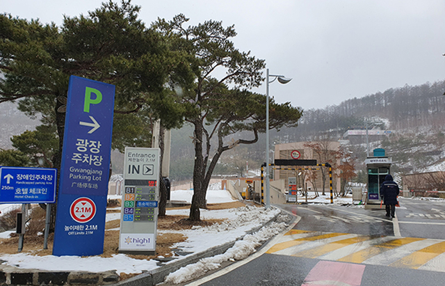 ▲강원랜드 카지노 임시휴장 연장에 이어 리조트의 모든 영업장까지 전면 휴장이 결정된 지난달 28일 오후 강원랜드 광장주차장 입구에는 진입차량이 없이 한가한 모습을 보이고 있다. 총 1909대의 승용차를 주차할 수 있는 광장주차장은 지하5층으로 조성되어 있다.ⓒ프레시안(홍춘봉)