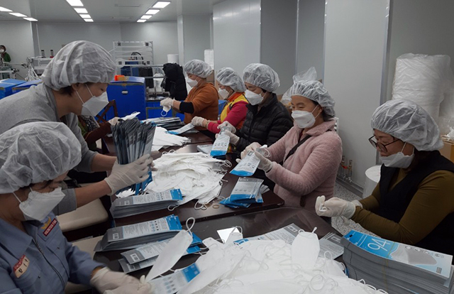 동해시 지흥동에 위치한 마스크 공장은 평소 16명의 직원이 근무하며 하루 3000장의 마스크를 생산해왔으나, 최근 마스크 주문 폭주로 지난 3일부터 동해시여성의용소방대의 자원봉사 인력을 지원받아 하루 6000장을 생산하고 있다.