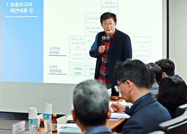 김광수 대표는 365세이프타운에 대해 운영인력의전문성 문제와 고객데이터 부족, 홍보전략 부족 등 15가지 문제점을 바탕으로 고객중심 전략화, 콘텐츠 고도화, 마케팅 적극화, 맨파워 강화, 당면과제 즉시 해결 등 5가지 경영목표를 제안했다.