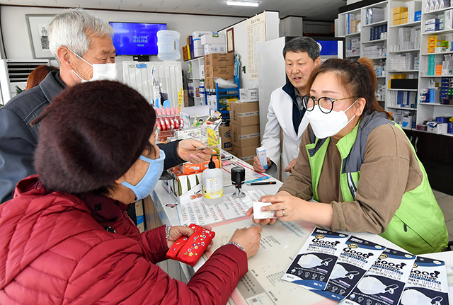 ▲나홀로 약국에 자원봉사자로 나서 마스크 판매를 지원하고 있다. ⓒ정선군
