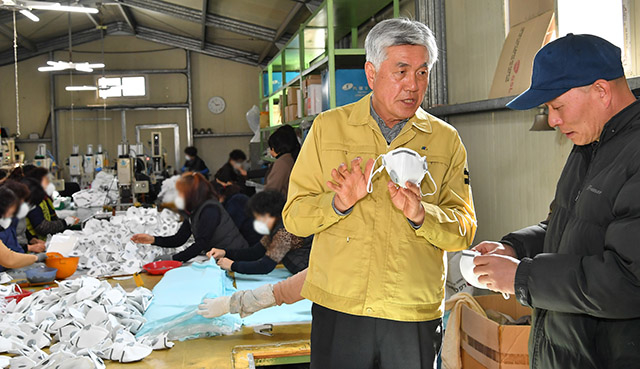 ▲최승준 정선군수가 증산농공단지의 마스크 생산공장에서 효율이 뛰어난 여과식 마스크를 살펴보고 있다. ⓒ정선군