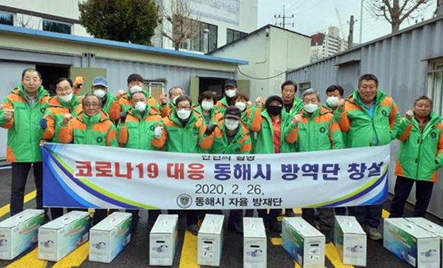 코로나19 확진자 없는 ‘청정 동해’를 위해, 동해시 지역자율방재단 이성우 단장을 비롯한 10개동 250여명의 단원들은 바쁜 생업 중에도 지역 재난안전의 파수꾼으로서 전염병 재난예방 등 봉사활동에 나섰다.