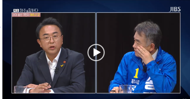 4.15총선 제주시갑 선거구 TV토론회 장면(왼쪽 고병수 후보, 오른쪽 송재호 후보) JIBS 화면 캡쳐