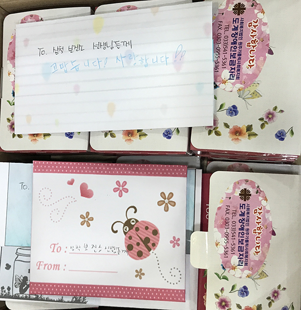 도계장애인보금자리는 “코로나19로 불안한 마음으로 생활하는데 든든하게 지켜주셔서 감사합니다. 저희도 손씻기, 마스크 착용 등 개인위생을 잘 지키겠습니다”는 손편지와 함께 감사, 응원의 마음을 전달해 코로나19 장기화로 지친 직원들의 기운을 북돋아 줬다.