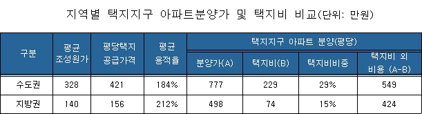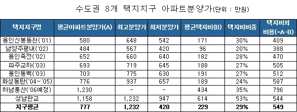 토지공사의 산하 연구기관인 국토도시연구원이 1일 발표한 <택지개발지구 아파트 분양가와 택지비 분석> 자료에 따르면, 화성동탄 등 2000년 이후 공급된 전국 17개 택지개발사업지구의 조성원가와 업체별 공동주택지 택지비, 분양가 등을 조사한 결과 택지지구 신규 아파트의 평균 택지비(용적률 감안)는 수도권이 평당 229만 원, 지방은 74만 원으로서, 아파트 분양가 중 택지비가 차지하는 비중은 각각 29%와 15%로 나타났다.