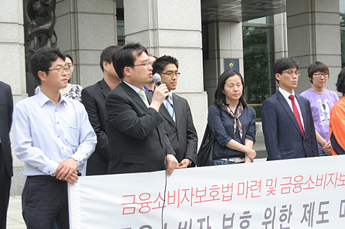 26일 시민단체들의 모임인 '금융소비자 권리 찾기 연석회의'는 서울 여의도 금감원 앞에서 기자회견을 열어 '금융소비자보호청(가칭)'과 금융소비자보호법을 만들 것을 촉구했다.