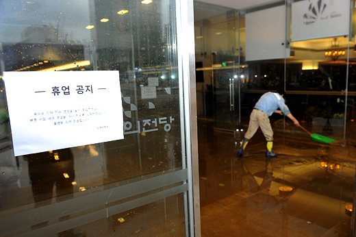 예술의 전당도 물바다였다. 이날 전체 공연이 모두 취소됐다. 군인들과 청소부, 직원들이 분주히 물을 퍼나르느라 정신이 없어 보였다. 쉴새 없이 구정물이 밖으로 밀려나왔으나, 작업은 끝날 것 같지 않았다. 혹시나 하는 마음에 이곳을 찾은 관객들은 허탈한 표정으로 건물을 빠져나왔다. 한 여성이 나오다 진흙을 밟았다. 그는 잔뜩 찡그린 표정으로 흙탕물에 발을 씻었다. 차량이동이 막힌 상황이라 인근 지하철역으로 그는 더 걸어야 한다. 다시 발이 더러워질 것이다.