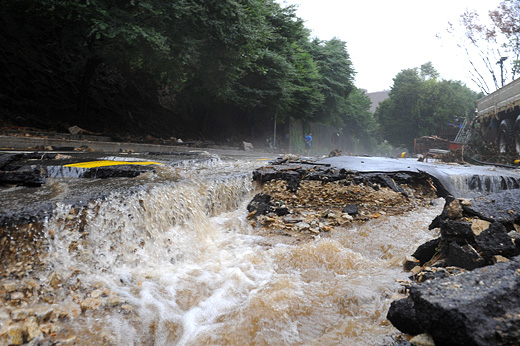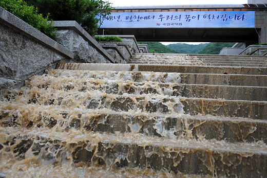 방배동 방향으로 좀 더 걸으니 국립국악원이 보였다. 흙탕물이 쉴새 없이 계단을 적시고 있었다. 국악원에는 "평창에서 우리의 꿈이 펼쳐집니다"는 현수막이 걸려 있었다. 그러나 동계올림픽을 유치한 나라의 수도는 수시간에 걸친 비로 폐허로 변했다.