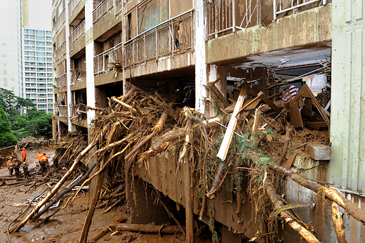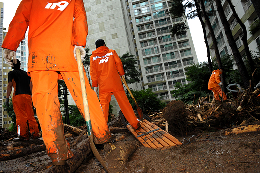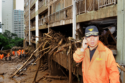 마치 전쟁이 난 듯했다. 대지진이 온 듯했다. 쓰나미가 휩쓴 것 같았다. 세련된 아파트 단지가 순식간에 참혹한 진흙구덩이로 변했다. 말끔한 단지에 어울리지 않을 듯한 나무토막들이 흉기처럼 집들을 뚫고 들어왔고, 그 사이로 진흙이 파도처럼 밀려들었다. 구조대원들이 재해와의 사투를 벌이고 있었다. 아찔한 장면이 많았다. 이들은 재해현장으로, 누구보다 먼저, 군말없이 가야만 하는 사람들이다.