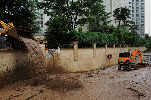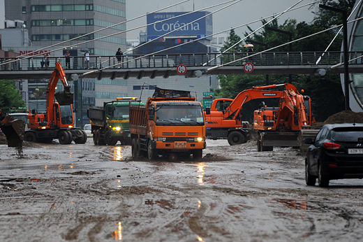 워낙 재해 규모가 커서인지, 도로 곳곳에는 우면산에서 밀려 내려온 나무토막이 제대로 정리되지 못한 채 방치돼 있었다. 인도는 뻘과 같았다. 어떤 이는 맨발로 도로를 터벅터벅 걸었다. 아스팔트 위로 작은 물길이 만들어지고, 그 옆으로 쓰레기더미가 떠다녔다. 사람들은 한국에서 가장 비싼 거리 중 하나가 쓰레기로 채워진 모습을 허탈한 표정으로 지켜봤다. 좀처럼 보기 힘들었던 한국의 모습이다.