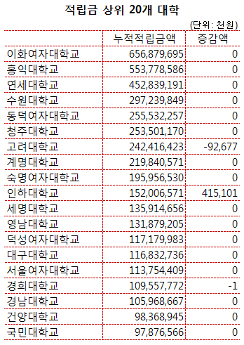 또 동덕여대(2555억 원), 청주대(2535억 원), 고려대(2424억 원), 계명대(2198억 원), 숙명여대(1959억 원)도 많은 적립금을 쌓아뒀다. 이들 상위 10개 대학은 지난 회계연도에도 적립금 규모 최상위권을 차지했다.