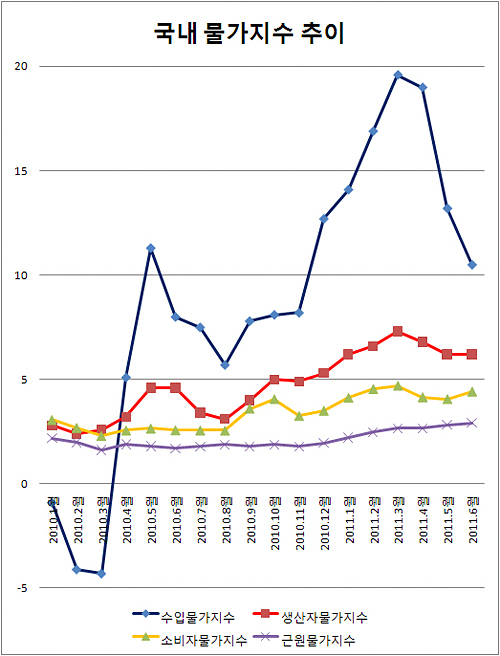30일 경제정의실천시민연합이 OECD 통계자료를 분석해 발표한 자료를 보면, 지난해 2분기 10위이던 한국의 물가상승률 순위는 지속적으로 올라, 올해 2분기 현재 4.21%를 기록해 회원국 중 영국에 이어 6번째로 높았다. 지난 1분기에는 4위까지 치솟기도 했다.