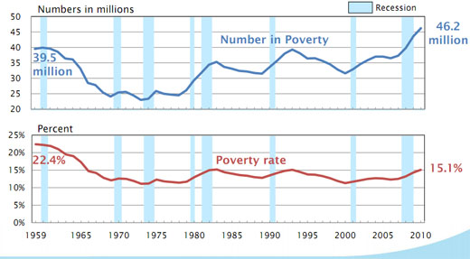 미국 인구통계국이 13일(현시시간) 발표한 통계에 따르면 2010년 미국의 빈곤층은 260만 명이 늘어난 4620만 명이다. 이는 인구통계국이 통계를 작성한 지난 52년 동안 가장 높은 수치다.