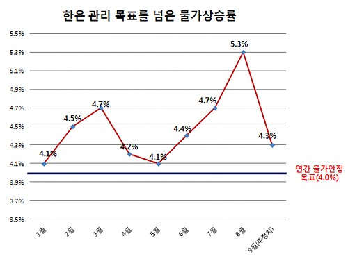 ▲연간 소비자물가 상승률. 올해 초부터 매달 한은의 물가안정 목표치인 4.0%를 넘고 있다. 9월 자료는 금융기관 추정치 평균. ⓒ프레시안