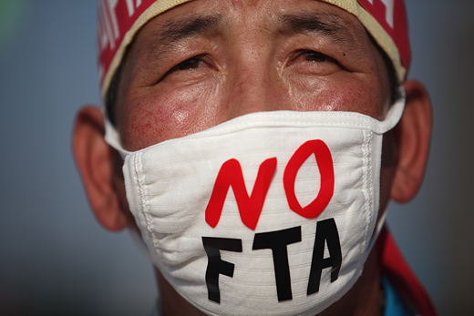 | ▲ 지난 6일 서울 여의도 문화마당에서 열린 '한·미 FTA 국회비준 저지 전국 농어민 결의대회'에 참가한 한 시위자. ⓒ프레시안(최형락) |