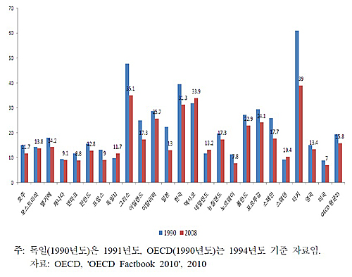 한국보다 자영업자 비중이 높은 나라는 그리스(35.1%), 멕시코(33.9%), 터키(39.0%) 등 소수에 불과했다. 한국과 마찬가지로 산업국가 중에서 자영업자 비중이 높았던 일본마저도 자영업자 비율은 1990년 22.3%에서 2008년에는 13.0%까지 떨어졌다.