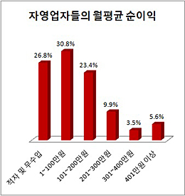소상공인진흥원이 지난해 7월 발표한 '전국 소상공인 실태조사 보고서'에 따르면 자영업자들의 30.8%가 월평균 순이익이 100만 원 이하에 불과했다. 적자를 보거나, 아예 수입이 없는 자영업자의 비중도 무려 26.8%에 달했다. 전체 평균 순이익은 불과 149만 원에 그친다.