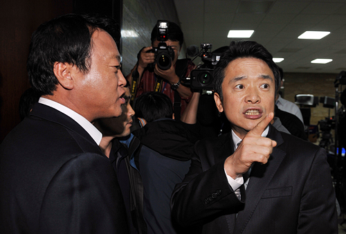 | ▲한미FTA 비준안 상정을 두고 여야의 신경전이 계속되는 가운데, 3일 오전 서울 여의도 국회에서 남경필 외통위위원장이 회의실로 들어가려다 조승수 의원과 설전을 벌이고 있다. ⓒ뉴시스 |