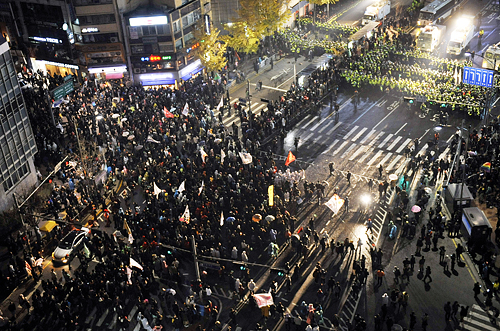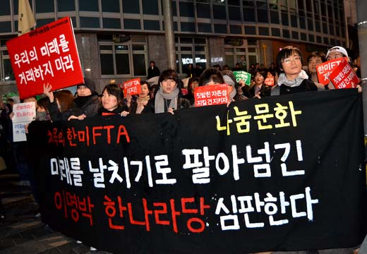 이날 오후 5시경부터 서울 여의도 산업은행 앞에서 한나라당의 한미 FTA 비준안 강행처리를 규탄한 시민들은, 이어 저녁 8시 30분경 명동로에 집결해 행진을 시도했다.