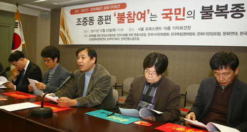 민주화를 위한 전국교수협의회, 민주사회를 위한 변호사모임, 전국시사만화협회, 한국독립영화협회, 문화다양성포럼, 문화연대, 한국민족예술인총연합, 스크린쿼터문화연대, 한국작가회의, 전국언론노동조합 등은 22일 오전 11시 프레스센터에서 기자회견을 열고 "조중동 종편 불참여는 국민의 불복종 선언"이라고 강조했다.