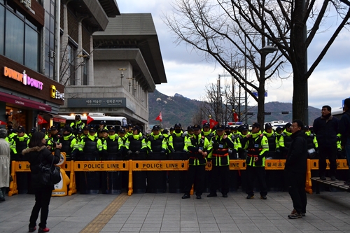 | ▲종편 개국쇼가 열린 지난 1일, 세종문화회관 주변을 막아선 경찰. 종편의 출범을 축하한 이들이 일부에 한정됐음을 상징하는 모습이다. ⓒ프레시안(김윤나영) |