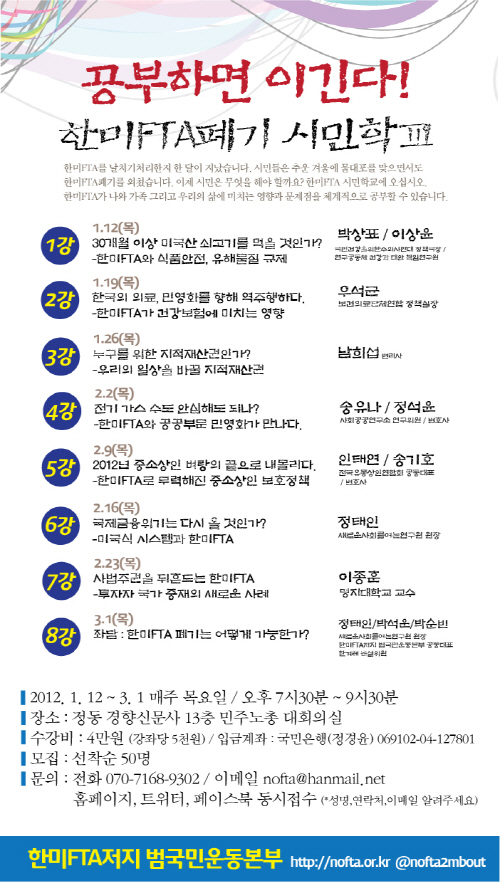 개설강좌는 서울 정동 경향신문사 13층 민주노총 대회의실에서 매주 목요일 오후 7시 30분부터 두 시간 동안 진행된다. 수강비는 4만 원으로, 선착순 50명의 수강생을 모집한다. 홈페이지(nofta.or.kr), 트위터(@nofta2mbout) 등에서 접수가 가능하다. 문의는 전화 070-7168-9302, 이메일 nofta@hanmail.net으로 하면 된다.