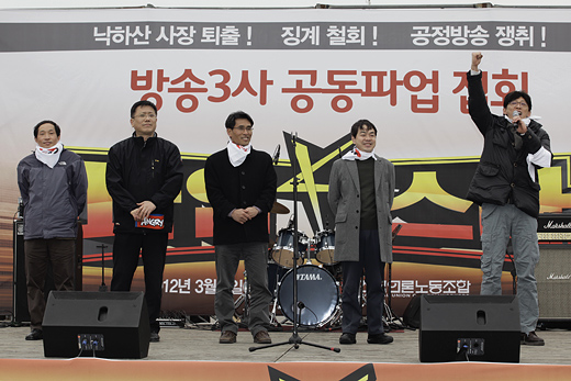 3사 노조위원장은 물론 SBS노조, 국민일보 노조위원장도 응원을 아끼지 않았다. 정영하 MBC 노조위원장은 "저들의 힘이 강할 때도 (방송사) 셋을 한꺼번에 바꾸진 못했다. 지금은 저들의 힘이 빠졌다"며 "이번 싸움은 우리가 반드시 이길 것"이라고 다짐했다.