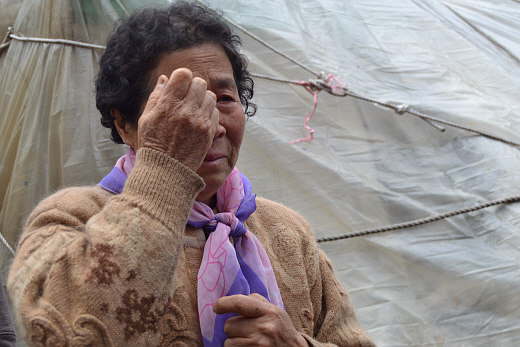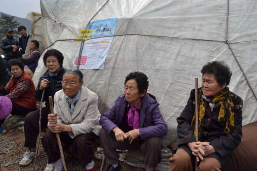 | ▲ 산에 천막을 치고는 번갈아 철야로 지키며 송전탑 공사 재개를 온몸으로 막고 있는 할머니들. ⓒ프레시안(김윤나영) |