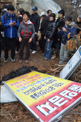 전국 각지에서 모여든 참가자들이 손자 손녀 같다며 대견해 하시던 그분들의 눈에서 순간 레이저가 뿜어져 나온다. 한전'놈'들 이야기가 나올 때. 평생을 자연 속에서 흙과 함께 살아오며, 노동의 결실로 한 해 한 해 살아가시던 이들을 그곳에서 간단하게 떼어내려 하는, 그냥 살던 대로 살게 해달라는 할머니 할아버지들의 호소에 코웃음치며 그들을 조롱하고 심지어 강아지 취급했던 손자뻘의 젊은 용역들로 대표되는, 거대한 벽이다. 화악산의 흙과 나무를 닮은 나이든 주민들은 중장비에 파헤쳐지고 밀리고 잘려나간 화악산의 흙과 나무의 처지와 다르지 않았다. 쫓겨나면 갈 곳이 없어 이래 죽으나 저래 죽으나 마찬가지라며 악에 받쳐 소리치고, 손자 손녀뻘 되는 이들 앞에서 눈물을 펑펑 쏟으시는 모습에, 노모를 두고 몸을 불살라서야 겨우 세상에 이야기할 기회를 얻은 일흔 넷 할아버지의 그을린 절규에 더 이상 무슨 말을 잇겠는가? "살만큼 살았다. 공사 재개하면 또 죽겠다. 두렵지 않다"라고 외치며 산에 천막을 치고는 번갈아 철야로 지키며 송전탑 공사 재개를 온몸으로 막고 있는 할머니 할아버지들, 험한 산길을 간신히 기어오르고, 걸어내려갈 수 없어 포대자루를 타고 겨우 내려가면서도 공사 중지할 때까지 계속 그렇게 하겠다 하신다.