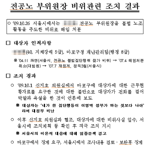 예를 들어 지난 2009년 10월, 서울시가 권모 전공노 부위원장을 '불법 노조 활동'을 주도한 혐의로 해임 처분한 데 대한 보고서인 '전공노 부위원장 비위관련 조치 결과'를 보면, 보고서에 "대상자는 '내가 한 집단행동이 이명박 정부가 하는 짓보다 나아'라며 대정부 비난"을 했다는 문장이 굵은 글씨로 강조돼 있고, 하단에는 "서울시의 미온적 대응에 대해 엄중문책 경고"를 지시했다는 후속조치가 설명돼 있다. 통상적인 감시 보고서 기능을 넘어 정부에 비판적인 공무원의 언행을 기록하고, 그 공무원을 엄벌하지 못한 지방자치단체에 대해 중앙정부 차원에서 책임을 물은 것이다. 정상적인 민주주의 국가에서 일어난 일이라 이해하기 어렵다.