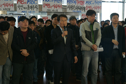 | ▲민주통합당 문성근 대표 대행이 17일 열린 MBC 노조의 기자회견에 참석해 파업 중인 언론 노조를 지지하는 발언을 하고 있다. ⓒMBC 노조 |
