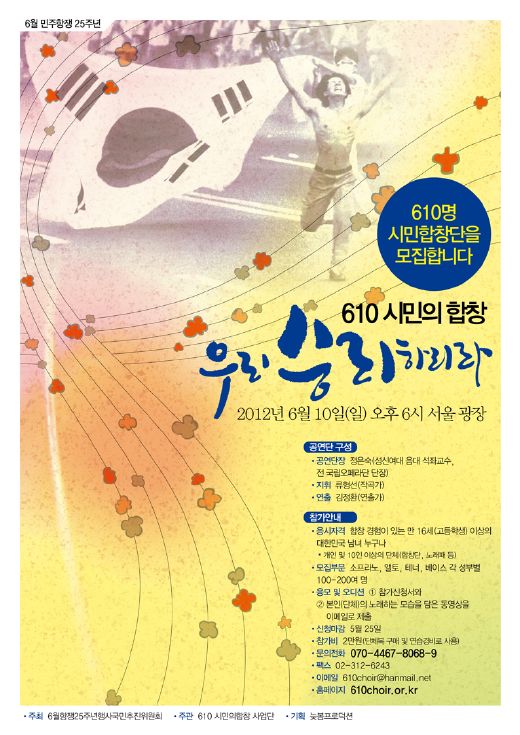 '6월항쟁 25주년 행사 범국민 추진위원회'는 다음달 10일 오후 6시 서울 시청광장에서 열리는 '610 시민의 합창:우리 승리하리라' 행사에 참여할 시민합창단을 모집한다고 밝혔다.
