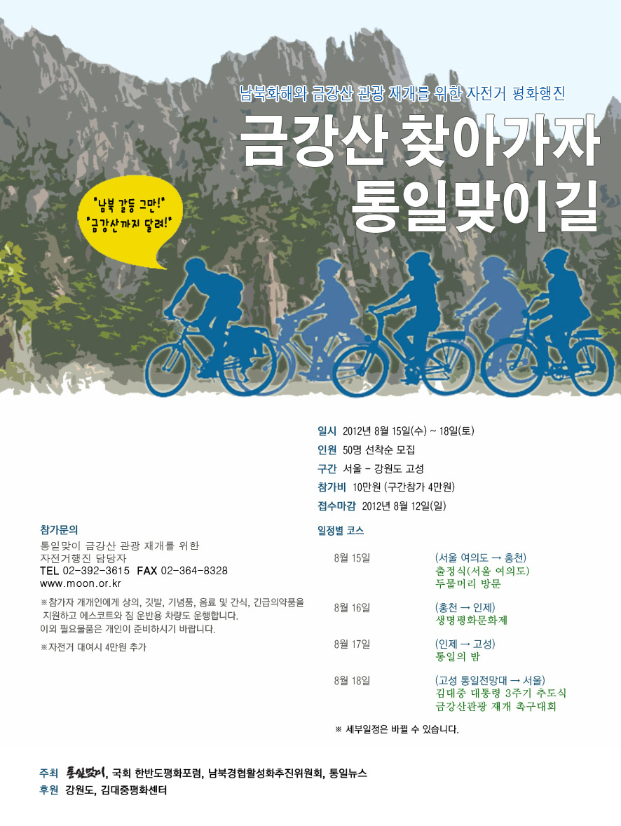이번 자건거 행진에 참가할 이들은 통일맞이 홈페이지(☞바로 가기)를 방문하거나 전화(02-392-3615)로 문의하면 된다. 선착순으로 50명을 모집하며 참가비는 10만 원이다.