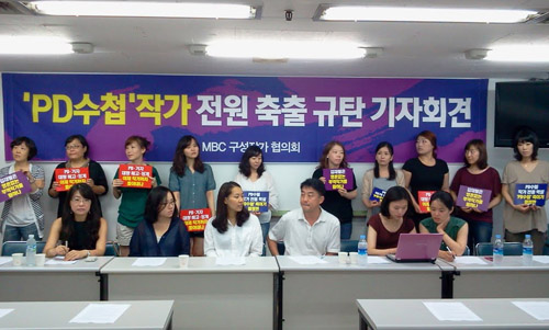 | ▲지난달 26일 방송작가들이 <PD수첩> 작가 집단해고 사태를 규탄하는 기자회견을 서울 영등포구 여의도 한국방송작가협의회 사무실에서 열고 있다. ⓒ프레시안(이명선) |