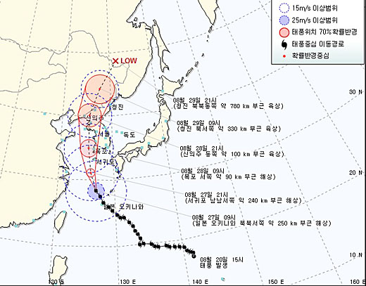 볼라벤은 오늘 밤 중 제주도 부근을 지나 서해상으로 진출할 것으로 예상되며, 내일 오후 서울과 가까운 경기 서해안 부근 바다를 지날 것으로 보인다. 내일 밤에는 북한 지방에 상륙할 것으로 예상된다.