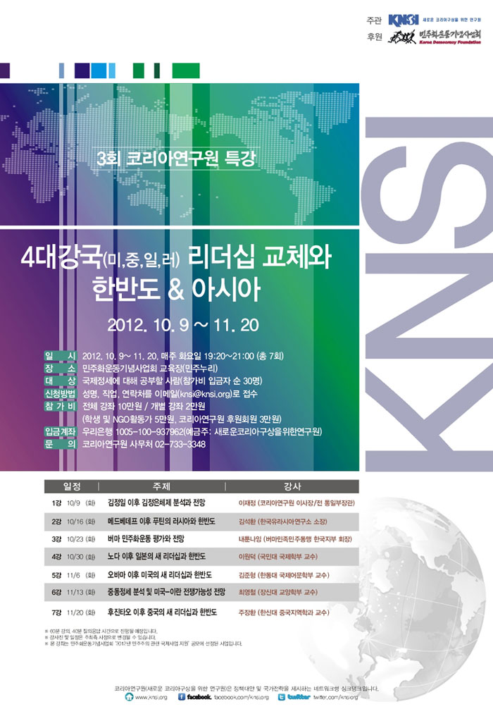 9일 첫 강의에서는 이재정 코리아연구원 이사장(전 통일부 장관)이 김정일 사후 김정은 체제에 대한 분석과 전망을 다룬다. 2강(10월 16일)에서는 드미트리 메드베데프에서 푸틴으로 대통령이 교체된 러시아의 한반도 정책을 조망하고 3강(10월 23일)에서는 최근 개방으로 동아시아에서 가장 주목을 받고 있는 버마(미얀마)의 정치경제 체제와 민주화 운동사를 돌아본다.