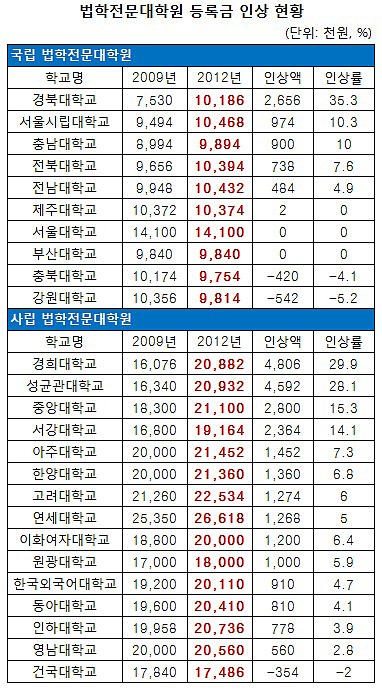 국립대 중에선 경북대 로스쿨이 2009년 753만 원에서 올해 1019만 원으로 266만 원(35.3%)을 올려 가장 인상폭이 컸다. 서울시립대와 충남대도 90만 원 이상 등록금을 올렸다.