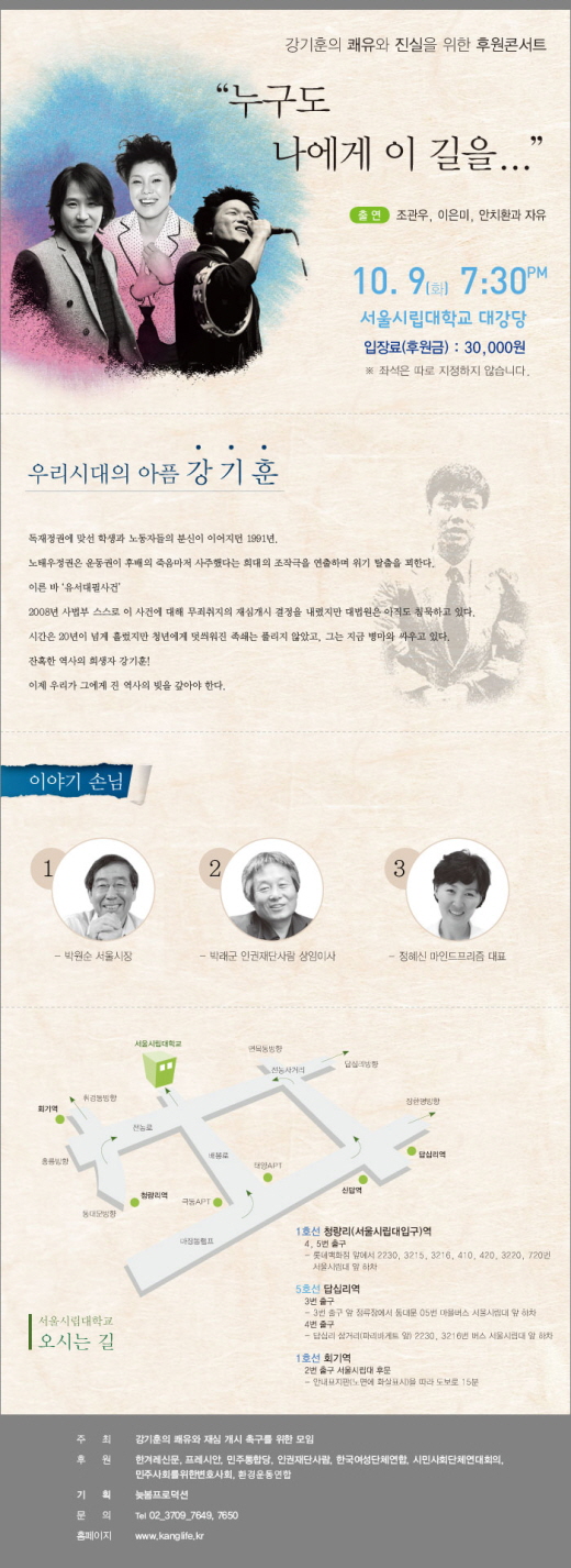 '강기훈의 쾌유와 재심개시 촉구를 위한 모임'(강기훈지킴이)의 주최로 열리는 이번 콘서트에는 가수 안치환, 이은미, 조관우, 평화의나무 합창단 등이 출연해 공연을 벌인다.