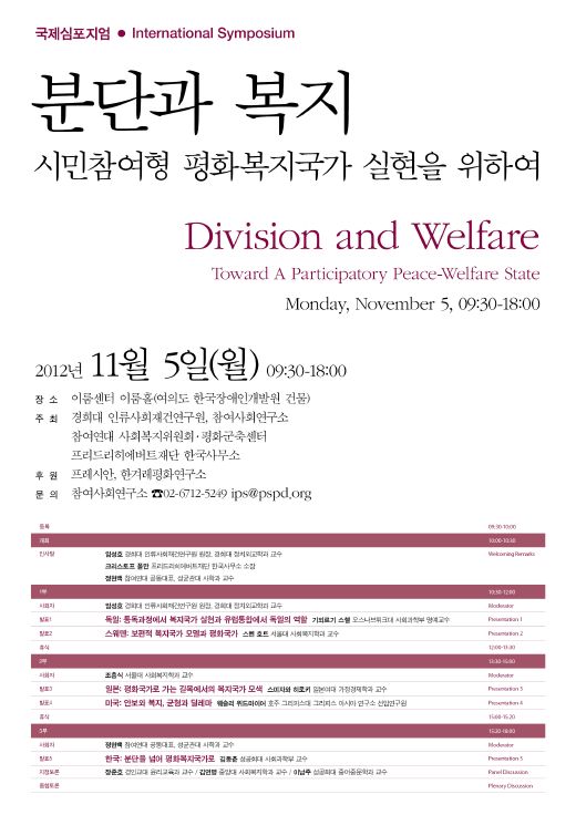 11월 5일 오전 9시30분부터 오후 6시까지 서울 여의도 한국장애인개발원 이룸센터 이룸홀에서 열리는 국제심포지엄 '분단과 복지 : 시민참여형 평화복지국가 실현을 위하여'는 그 동안 복지국가 논쟁에서 제대로 검토되지 못했던 한반도의 분단이라는 현실에 주목해 한국형 복지국가 건설을 논의한다.