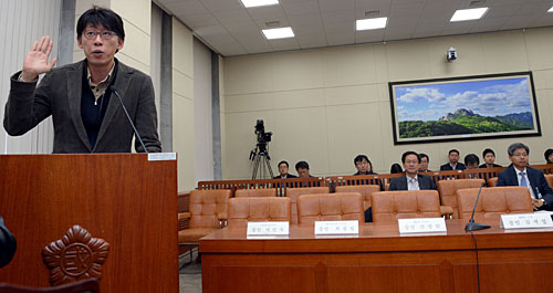 | ▲MBC 장기파업 관련 정문회가 열린 12일 오전 서울 여의도 국회 환경노동위원회 회의실에서 새누리당 의원들과 MBC 김재철 사장, 안광한 부사장, 이진숙 홍보본부장, 정수장학회 최필립 이사장이 불참한 가운데 정영하 MBC 노조위원장이 선서를 하고 있다. ⓒ뉴시스 |