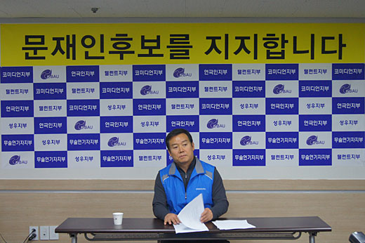 | ▲한영수 한연노 위원장이 14일 오후 문재인 민주통합당 지지 선언문을 발표하고 있다. ⓒ한연노 제공 |