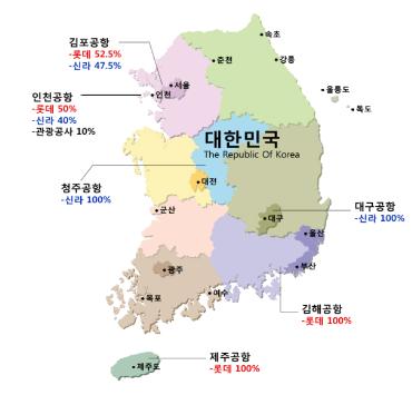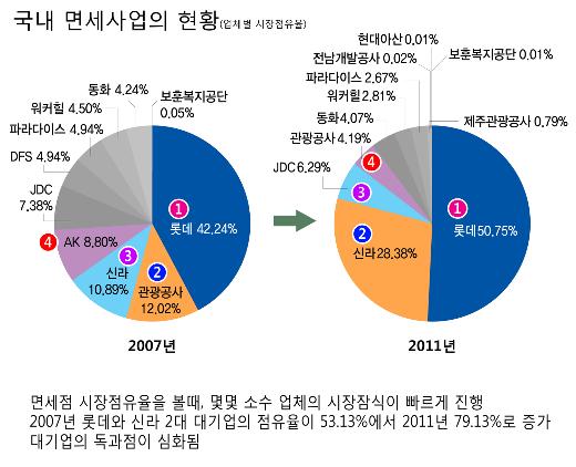 | ▲ 2011년도 대한민국 면세시장의 공항 및 시내면세점 등 매출점유율. |