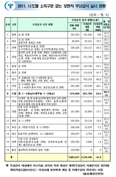 '소득 구분 없이 모든 학생을 대상으로 초등학교(2011년), 중학교(2012년)에서 전면 무상급식 실시'라고 표현한 것에 대해서도 시교육청은 "시교육청 무상급식 계획과 다르다"며 반발하고 있는데, 시교육청이 지난해 8월 확정한 무상급식 계획은 '2011년 초등학교 전체, 2012~2014년 중학교 1~3학년 단계적 실시'라는 것으로 주민투표안과는 다르답니다.