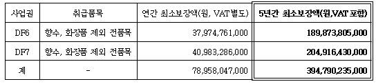 이번 입찰에서 두 개 사업권 중 하나인 DF6 매장 면적 1338.4㎡(약 405평)에 대한 1년간 최소 보장액은 379억여 원이고, 또 다른 하나인 DF7 매장 면적 1385.3㎡(약 419평)에 대한 1년간 최소 보장액은 409억여 원이다. 두 사업권 공간을 합치면 총 매장 면적은 2723.7㎡(약 824평)이며 최소 보장액 합산액은 1년간 789억여 원이다. 최소 보장액 제도란 임대권자가 정한 최소 보장액 이상을 써낸 업체 중에서 최고가를 써낸 적절한 자격을 갖춘 업체가 낙찰자가 되는 제도이다(면세점 사업자는 매출에 상관없이 공항공사에 의무적으로 매년 최소 보장액을 내야 한다. <편집자>). 이번 입찰에서 두 개 사업권 낙찰 합산 금액이 약 800억 원~900억 원 정도가 될 것으로 업계는 예상하고 있다.