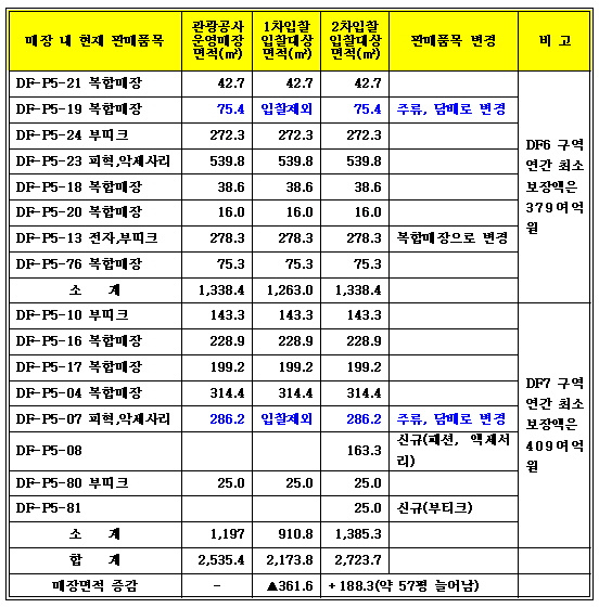 우선 운영 기간을 2년에서 5년으로 늘렸고, 입찰 기간도 1주일에서 한 달로 확대했다. 임대 보증금도 보증서로 대체할 수 있도록 허용하였다. 또 1차 입찰 때는 별도 입찰을 위해 빼놓았던 품목인 주류와 담배를 판매 품목에 포함했다. DF6 구역 중 75㎡(약 23평) 공간과 DF7 구역 중 286㎡(약 87평) 공간에 한해 술과 담배 판매가 허용된 것이다. 이에 따라 전체 입찰 면적이 1차 입찰 시 2173㎡에서 2차 재입찰 시에는 2723㎡(약 824평)로 늘었고, 구역별 최저 입찰가도 238억 원과 283억 원에서 각각 379억여 원(DF6 구역)과 409억여 원(DF7 구역)으로 올랐다. 입찰 참가 신청 마감은 2월 25일이며 새 사업자 선정을 위한 가격 입찰일은 2월 26일이다.