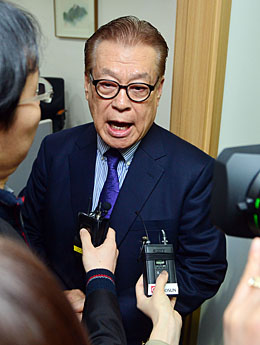 | ▲방송문화진흥회 김재우 이사장이 13일 방문진 이사회에 참석한 후, 이사장실 앞에서 취재진과 대화하고 있다. ⓒ뉴시스 |