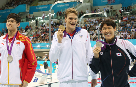 | ▲ 지난달 30일(현지시간) 영국 런던 올림픽파크 아쿠아틱스 센터에서 열린 2012 런던올림픽 남자 자유형 200m 결승에서 1분44초93으로 쑨양(왼쪽)과 공동 은메달을 차지한 박태환이 메달을 들고 활짝 웃고 있다. 가운데는 금메달을 차지한 프랑스의 야닉 아넬.. ⓒ연합뉴스 |