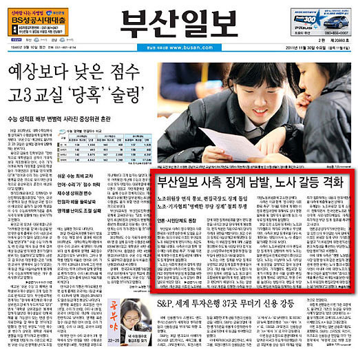 | ▲ 2011년 11일 30일 자 <부산일보>. "부산일보 사측 징계 남발, 노사 갈등 격화"라는 기사가 실린 이날 신문은 인쇄되지 않았다. ⓒ부산일보 노조 제공 |