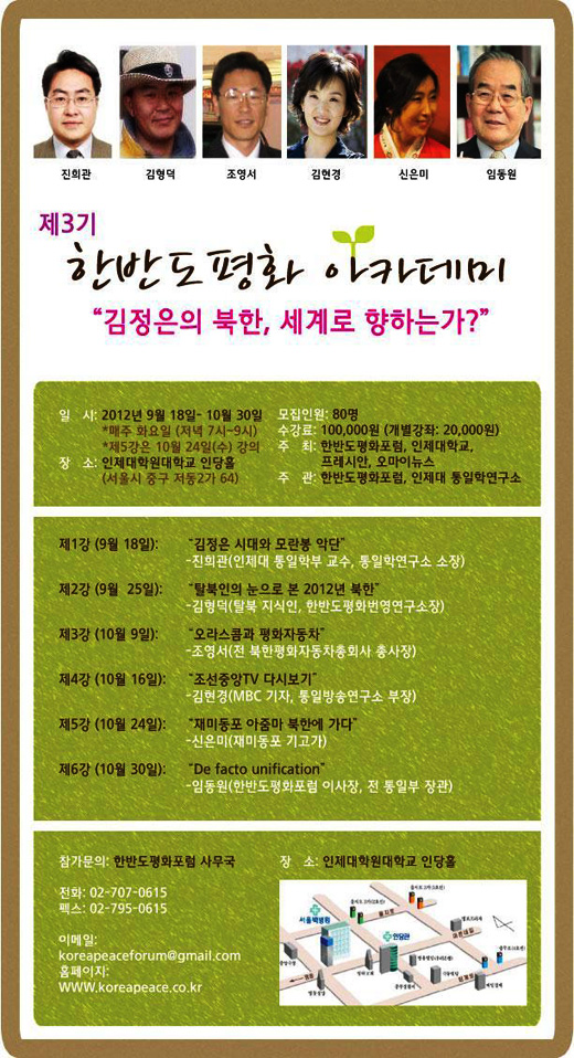 한반도평화포럼과 인제대학교가 공동 주관하는 제3기 한반도평화아카데미는 '김정은의 북한, 세계로 향하는가?'라는 주제로 오는 9월 18일부터 10월 30일까지 매주 화요일 저녁 7시~9시 서울 중구 저동2가 인제대학원대학교 인당홀에서 진행됩니다.