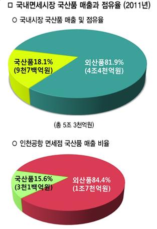최근 시내면세점의 국산품 매출이 많이 늘어났다고 발표되고 있기는 하지만 2011년 대한민국 전체 면세시장의 외산수입품 매출 4조 4000억 원(81.9%)에 비하면 국산품 매출은 9700억 원(18.1%)으로 외산수입품에 비해 여전히 상대적으로 작은 매출규모 속에서의 성장이라 할 수 있다. 전체 면세시장에서 국산품 매출의 성장만을 이야기하는 것은 '국산품 매출 고속 성장 중'이라는 착시현상을 유도할 뿐이다. 면세시장에서 국산품 매출이 증대되는 것에 비례해서 면세점에서 판매할 외산수입품들의 매출도 증대하고 있다. 따라서 면세점에서 판매할 외산품 수입에 따른 국부유출 금액 또한 늘어나고 있는 것이다.